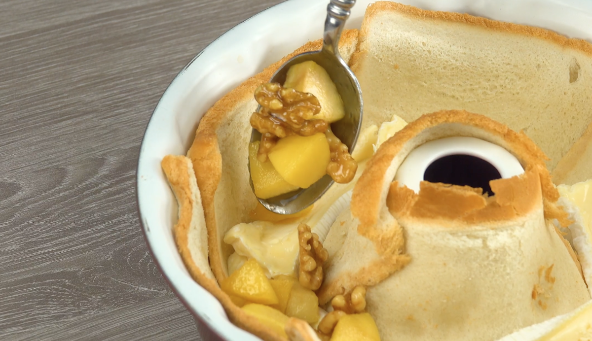 2.3) Gib nun die Walnüsse und die Apfelstücke auf den Camembert in die Kuchenform.