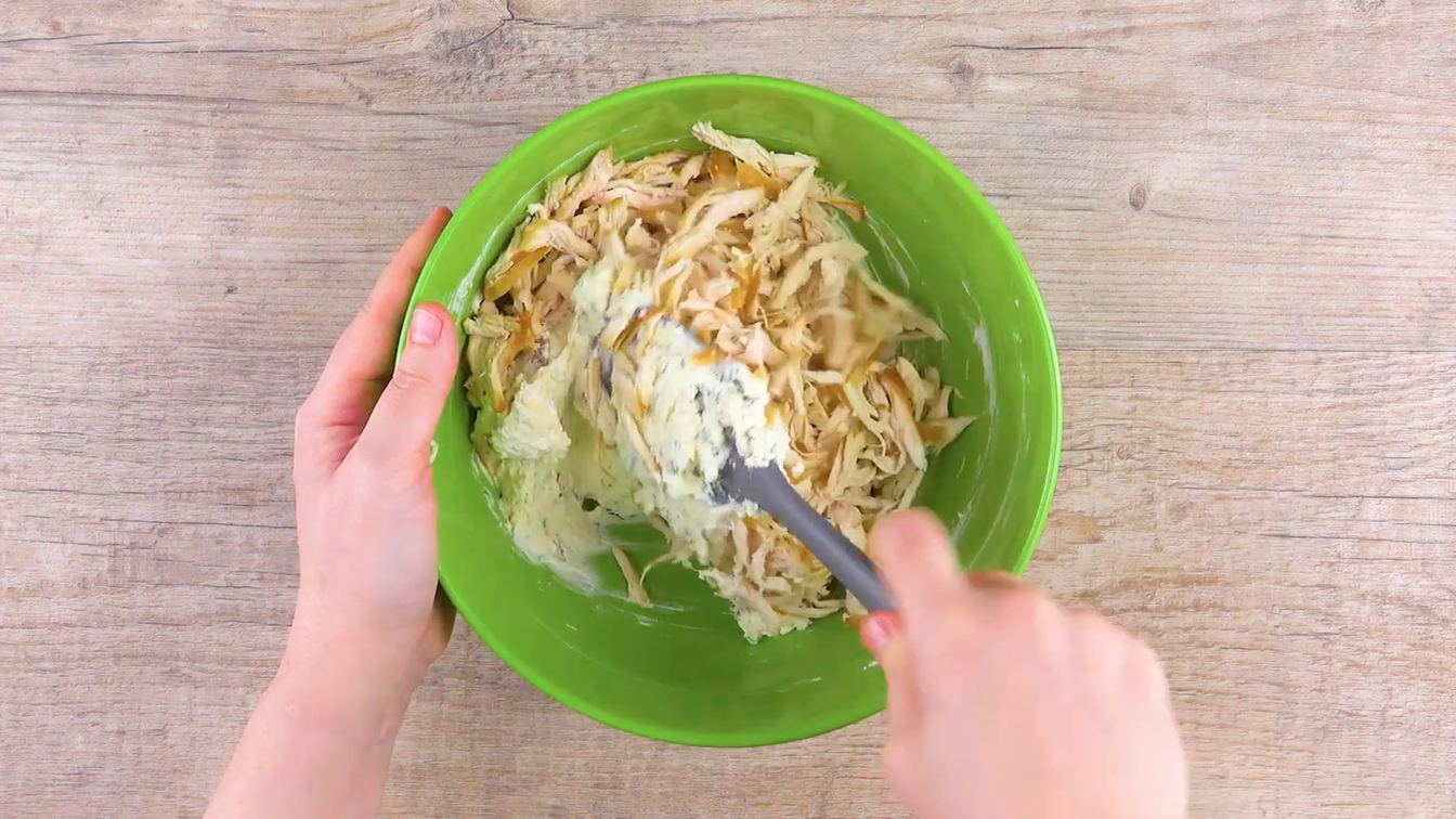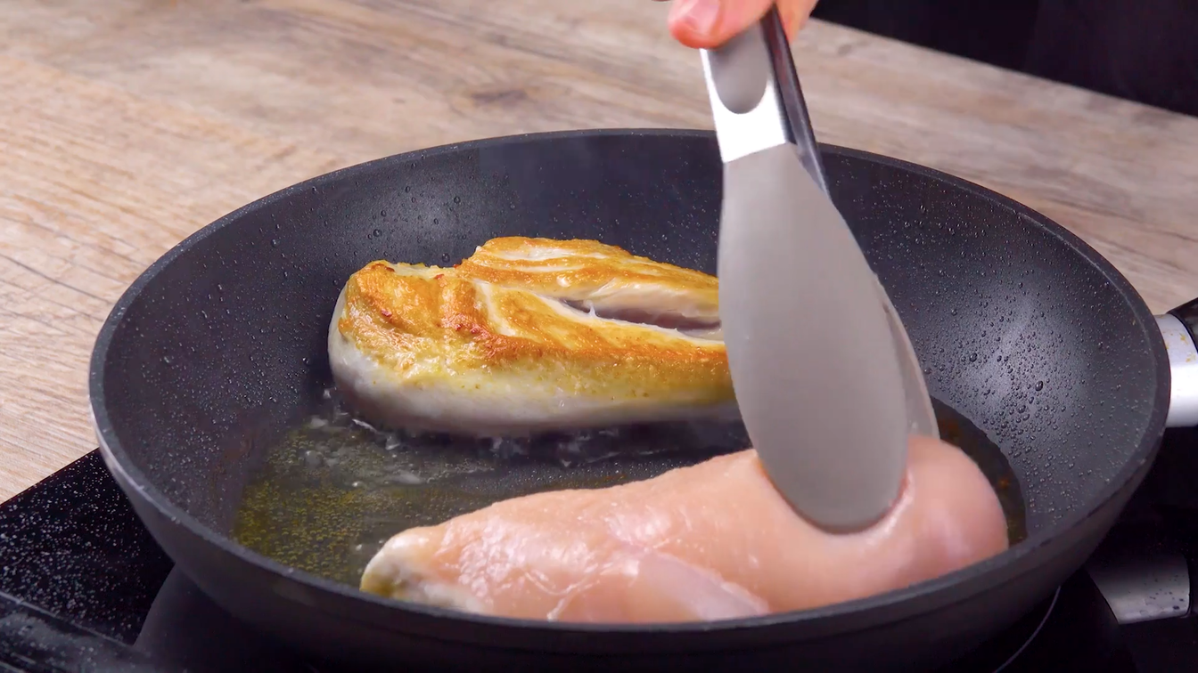 2.) Erhitze das Öl und brate die Hähnchenbrüste beidseitig leicht braun an. Nimm sie aus der Pfanne und brate danach noch den Bacon knusprig an. Zupfe währenddessen die Hähnchenbrust klein, z.B. mithilfe zweier Gabeln.