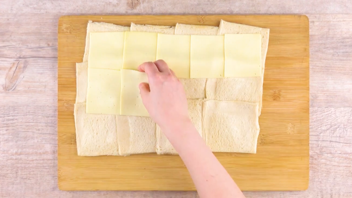 So geht es: 1.) Entrinde alle Toastscheiben und lege diese in drei Reihen à vier Scheiben aus. Achte dabei darauf, dass sich die Scheiben stets etwas überlappen. Nun rolle mehrmals kräftig mit einem Nudelholz über die Scheiben, um sie miteinander zu verbinden. Pass auf, dass sich die Scheiben dabei nicht auseinanderschieben. Du kannst das Brot auch an den Stellen, die sich überlappen, mit etwas Wasser anfeuchten. So sollten sich die Scheiben leichter verbinden lassen. Danach legst du den Käse in je fünf Scheiben nebeneinander und in drei Reihen untereinander auf die Toast-„Basis“.