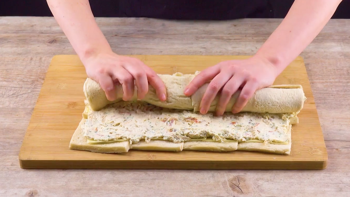 4.) Rolle nun das Brotrechteck ausgehend von der längeren Seite fest und eng zusammen. Bestreiche die Rolle dann mit reichlich flüssiger Kräuterbutter.