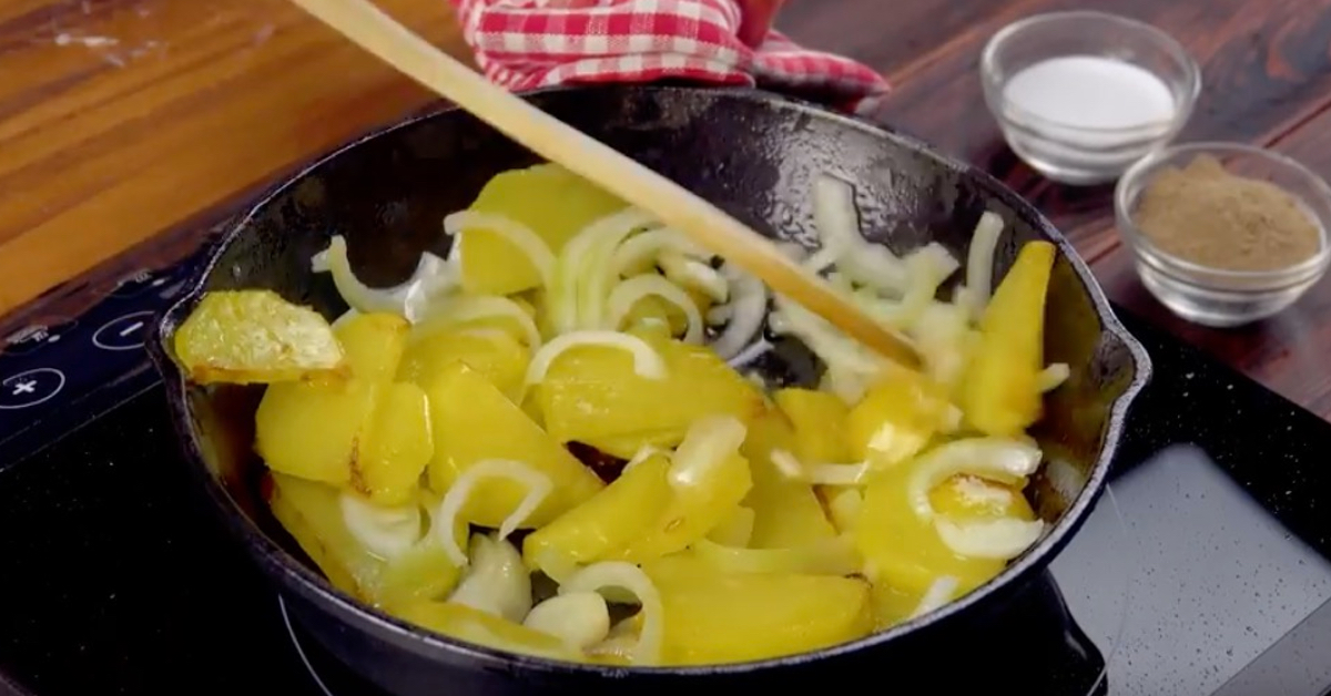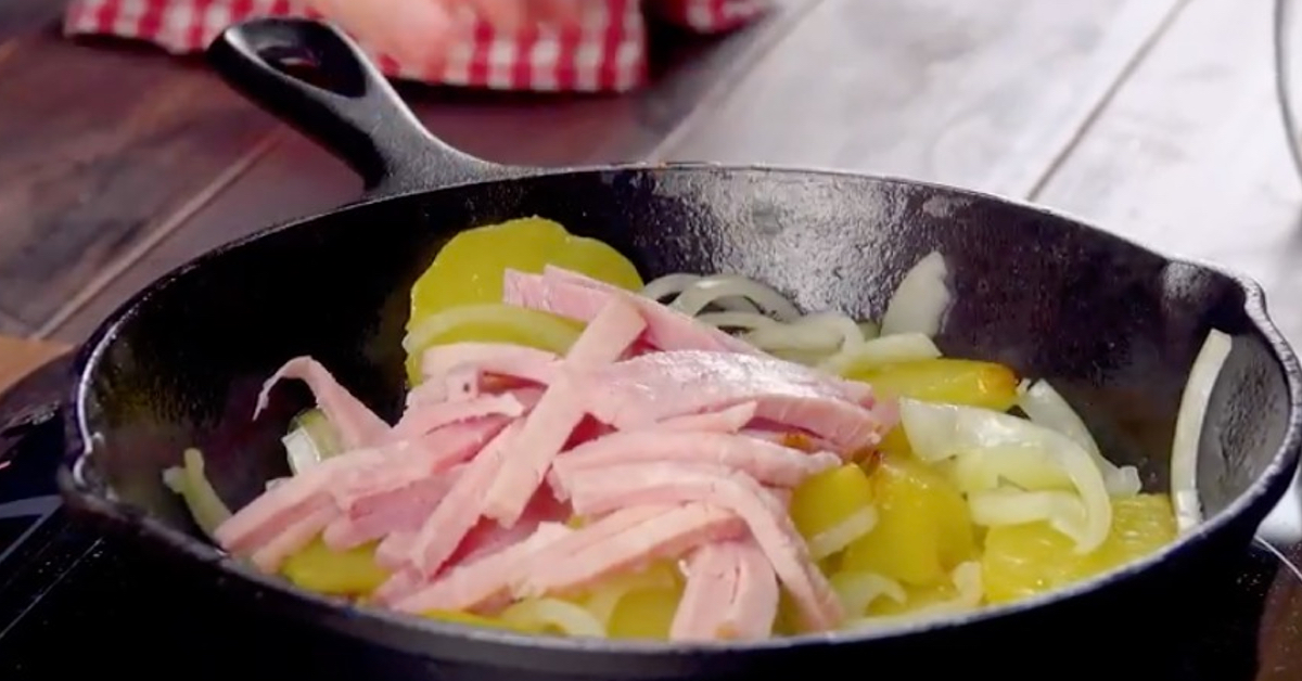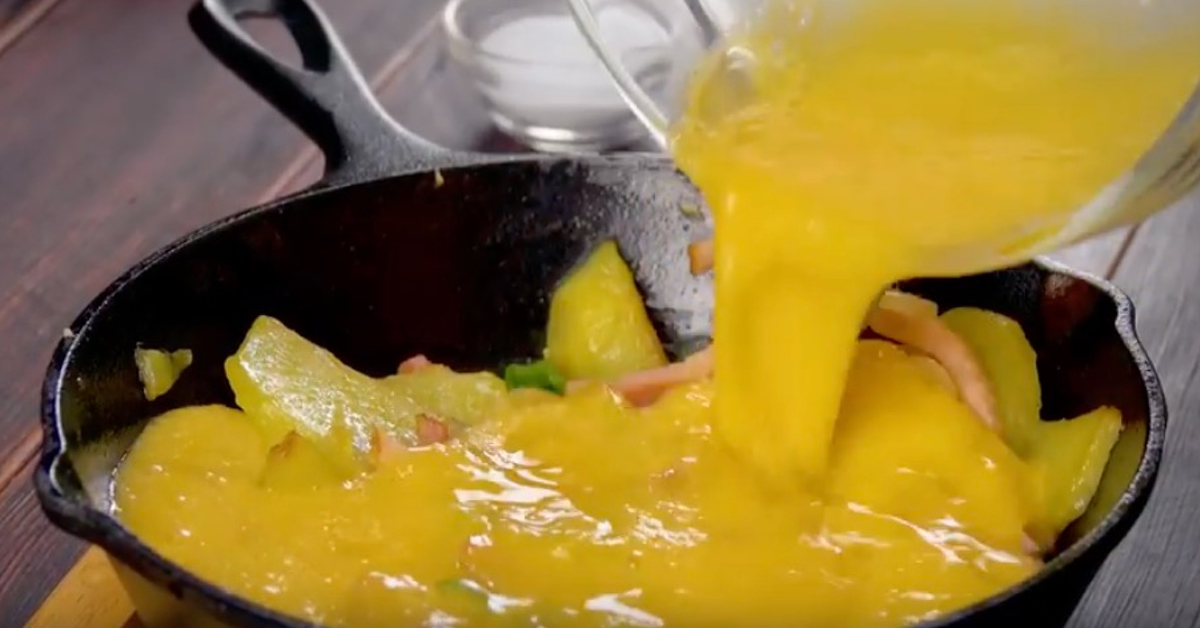 5.) Wenn alles lecker knusprig angebraten ist und die Kartoffeln nicht mehr roh sind, nimm die Pfanne vom Herd. Verquirle die Eier mit Salz und Pfeffer und schütte die Mischung vorsichtig in die Pfanne.