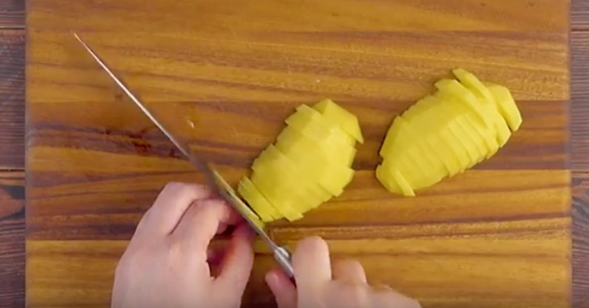 1.) Schäle die Kartoffeln, halbiere sie der Länge nach und schneide sie in feine Scheiben.