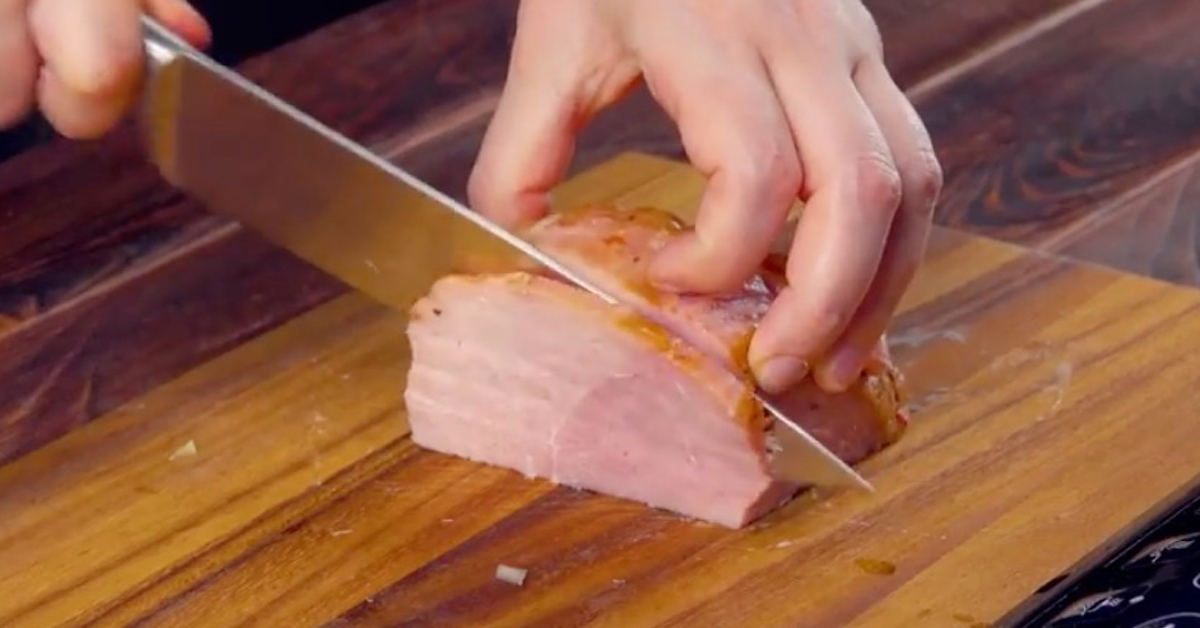 3.) Schneide nun auch den Schinken in Streifen und gib ihn zu den Kartoffeln hinzu.