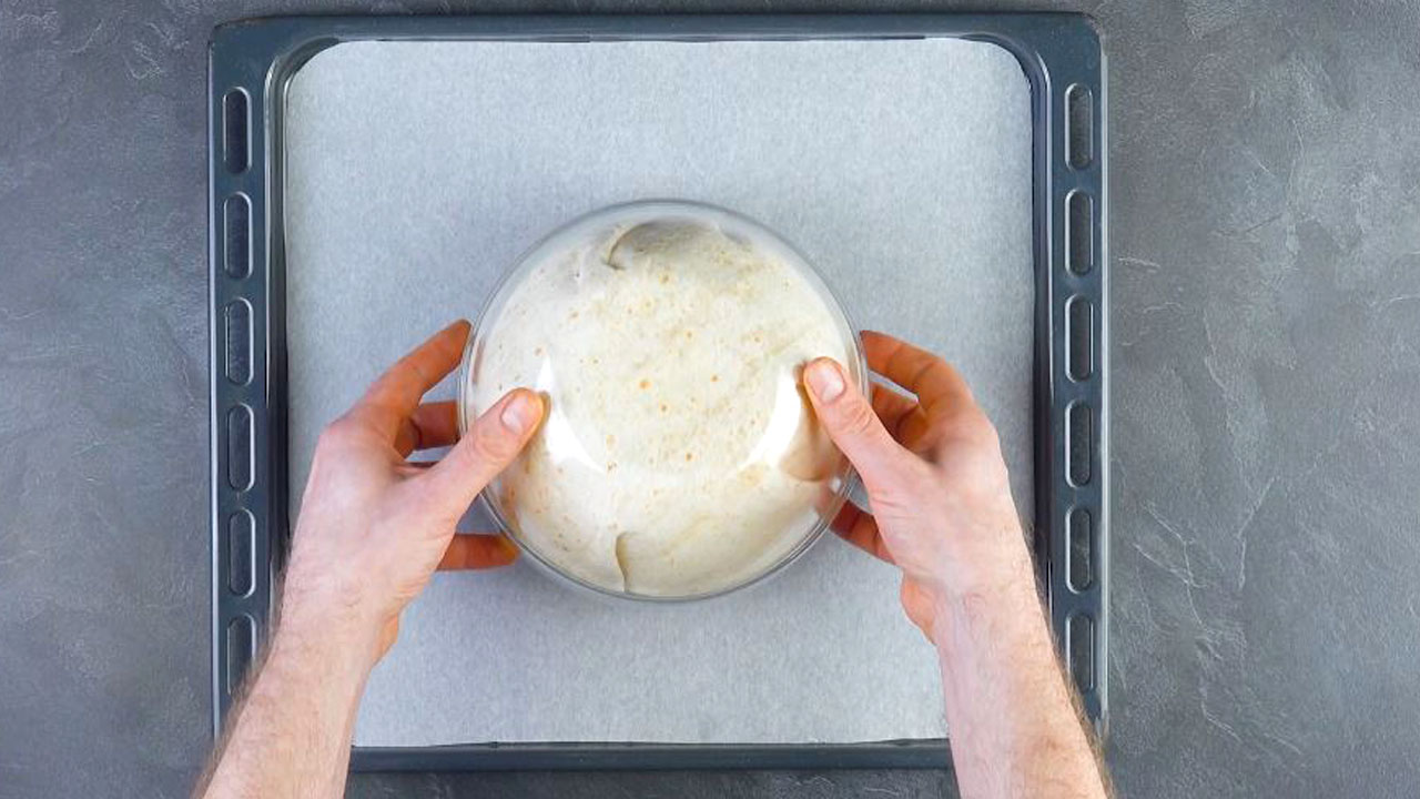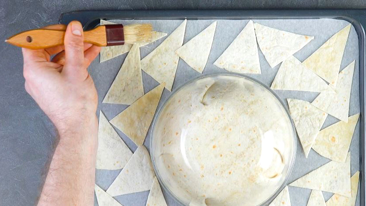 1. Platziere die kleinere Schüssel kopfüber auf deiner Arbeitsplatte, lege zwei der Tortilla-Wraps über sie und setze die größere Schüssel ebenfalls kopfüber auf die Wraps. Drücke die Schüssel dann langsam nach unten. So entsteht die spätere Wrap-Schale für den Dip.