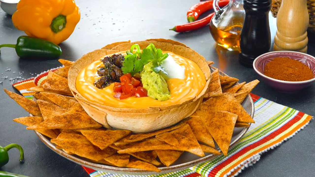 10. Stelle zum Schluss die gebackene Schale in die Mitte eines Tellers, verteile die Tortilla-Chips drumherum und fülle den cremigen Käsedip hinein.