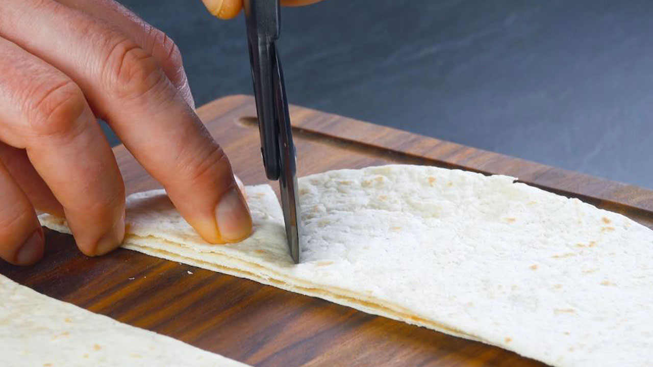3. Lege die restlichen drei Wraps übereinander auf ein Brett und schneide sie mit einem Pizzaschneider in gleichmäßige Dreiecke.