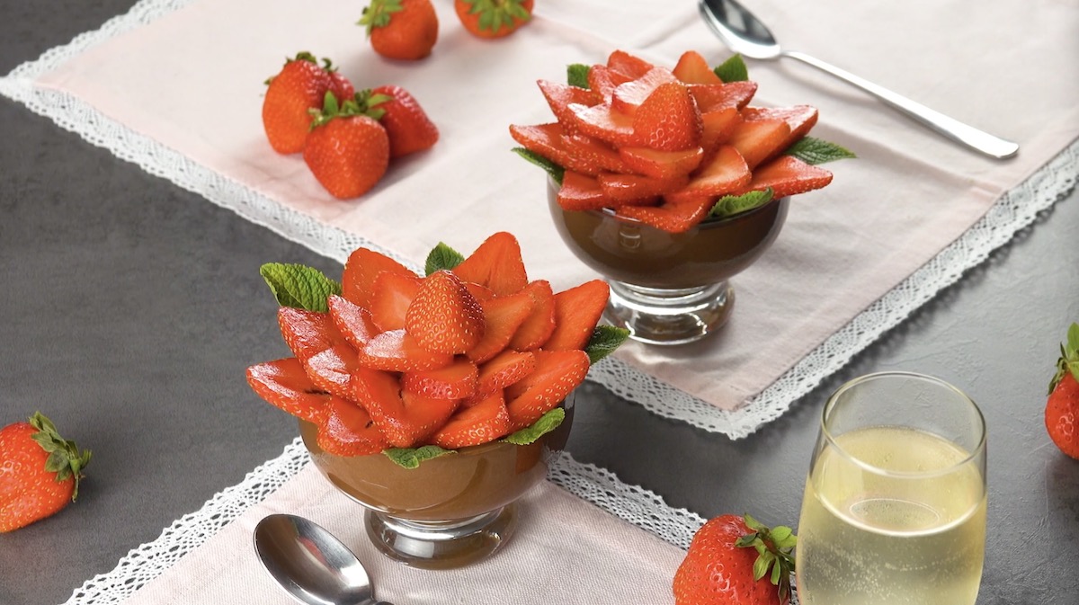 Nur Pudding zum Nachtisch ist doch unspektakulär! Kröne dein Dessert doch einfach mit einer Blüte aus Erdbeeren. Schneide dafür Erdbeeren in Scheiben und arrangiere sie mit Minzblättern so auf dem Pudding, dass sie aussehen wie eine Blüte. Mit dieser Dekoration hinterlässt auch die langweiligste Nachspeise einen bleibenden Eindruck, versprochen.