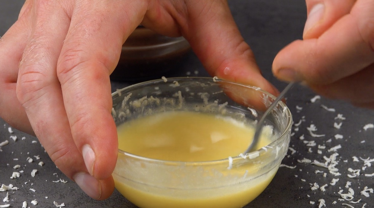 6.) Hole dann erstmal die drei einzelnen Eiskugeln wieder aus dem Gefrierfach und erwärme sie leicht in der Mikrowelle bei ca. 50 – 60 °C; alternativ kannst du natürlich auch warten, bis die Kugeln geschmolzen sind. Rasple nun die weiße Schokolade in das flüssige Vanilleeis und rühre um.
