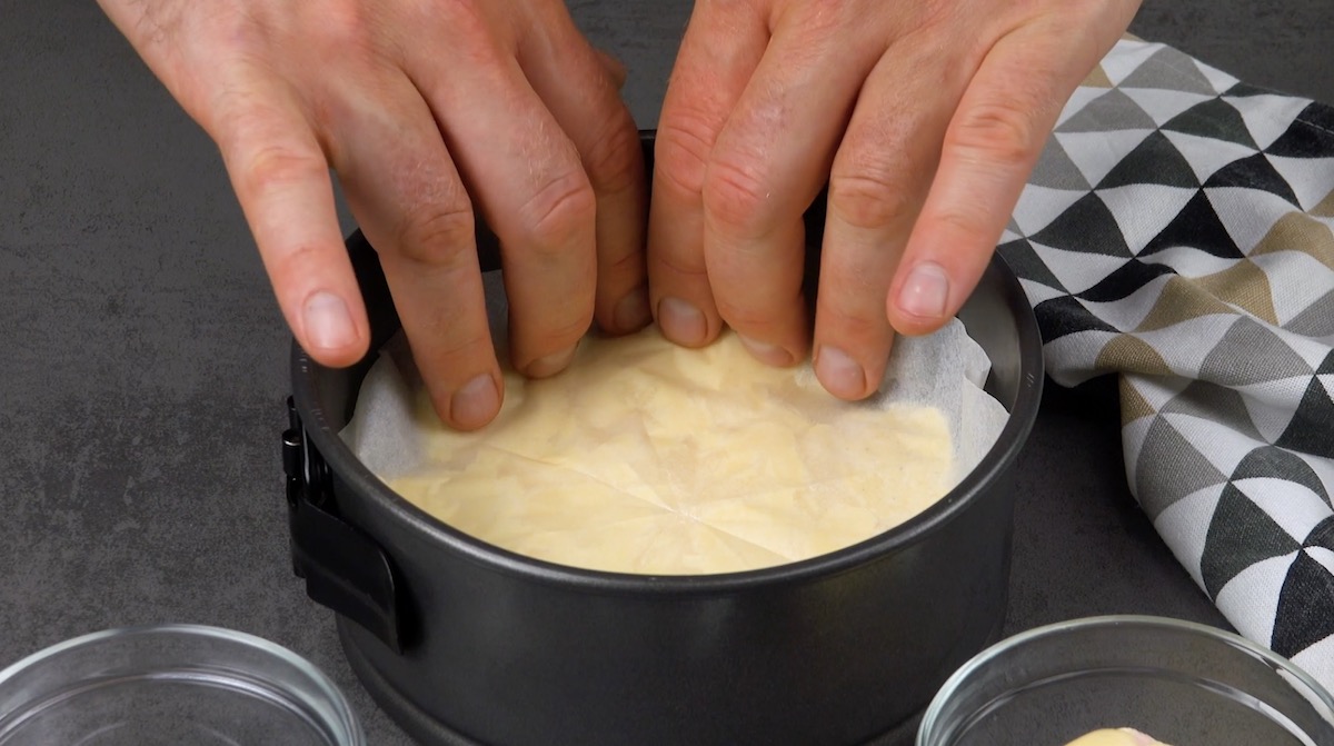 1.) Lege eine Springform (Durchmesser: 18 cm) mit zugeschnittenem Backpapier aus. Nimm vom Vanilleeis eine Kugel ab und friere sie ein. Verteile den Rest des Vanilleeises auf dem Boden der Springform, bedecke es anschließend mit Backpapier.