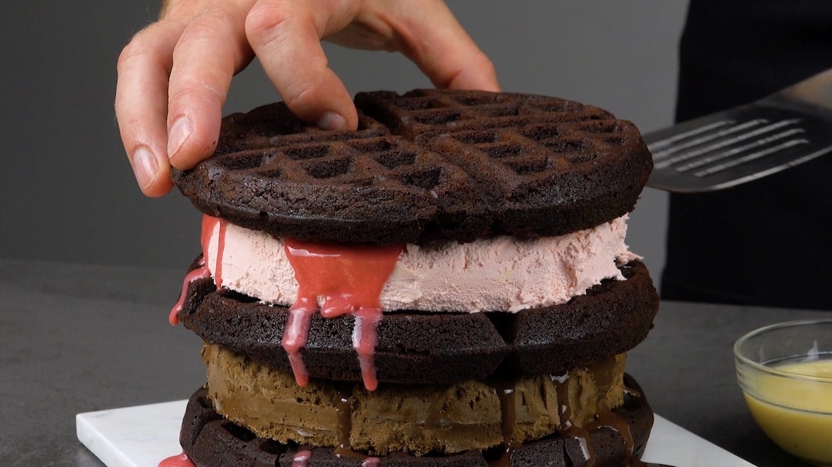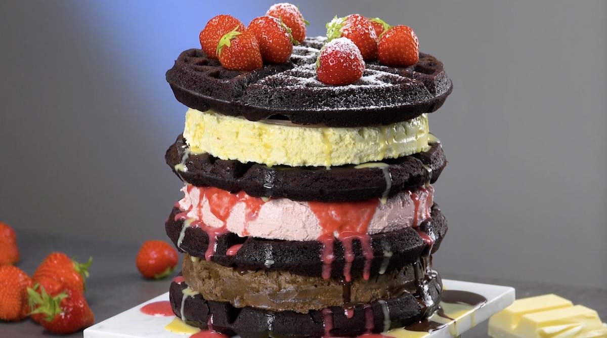 Dieser Turm ist für alle, die weder Eis noch Waffeln widerstehen können, der Inbegriff von Perfektion. Falls du deine Waffeln aber lieber ohne Eis genießen möchtest, schau dir diesen Waffelkuchen an, er besticht durch seine cremige Füllung.