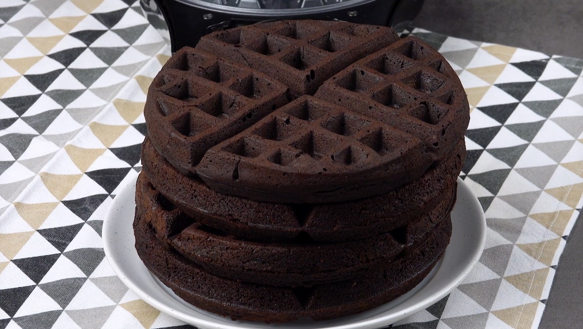5.) Schlage Eier mit Vanilleextrakt und lauwarmem Wasser schaumig auf. Rühre anschließend Kakao, Zucker, Salz, Backpulver und Mehl ein und hebe zuletzt die Schoko-Butter-Masse unter. Lass den Teig eine halbe Stunde im Kühlschrank quellen, bevor du daraus in einem eingefetteten Waffeleisen vier Waffeln backst und diese dann vollständig auskühlen lässt.