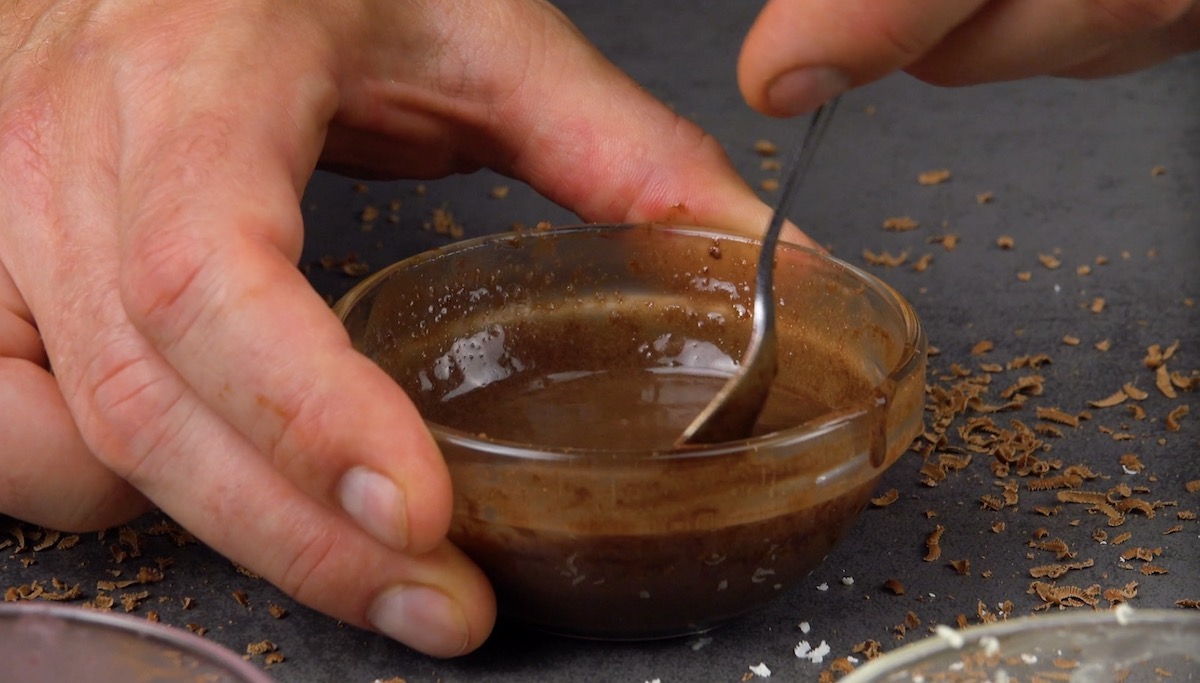 8.) Rasple die dunkle Schokolade in das flüssige Schokoladeneis und rühre gut um.