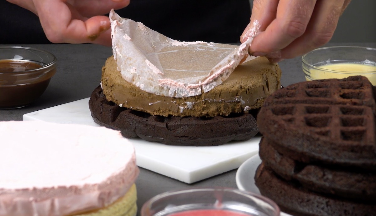 10.) Verteile die Schokoladensoße oben auf dem Eis und bedecke das Ganze mit einer Waffel. Stürze dann das Erdbeereis darüber, entferne das Backpapier, verteile die Erdbeersoße darüber und schließe auch diese Schicht mit einer Waffel ab.