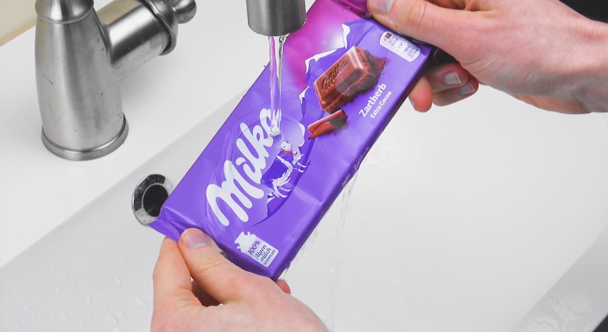 6.) Nun muss die Kuvertüre zubereitet werden. Halte dazu eine Tafel Schokolade (Vollmilch oder Zartbitter, je nach Geschmack) unter fließendes heißes Wasser, bis sie geschmolzen ist. Gieße die geschmolzene Schokolade in ein Glas und verrühre sie, bis eine glatte und geschmeidige Kuvertüre entsteht.