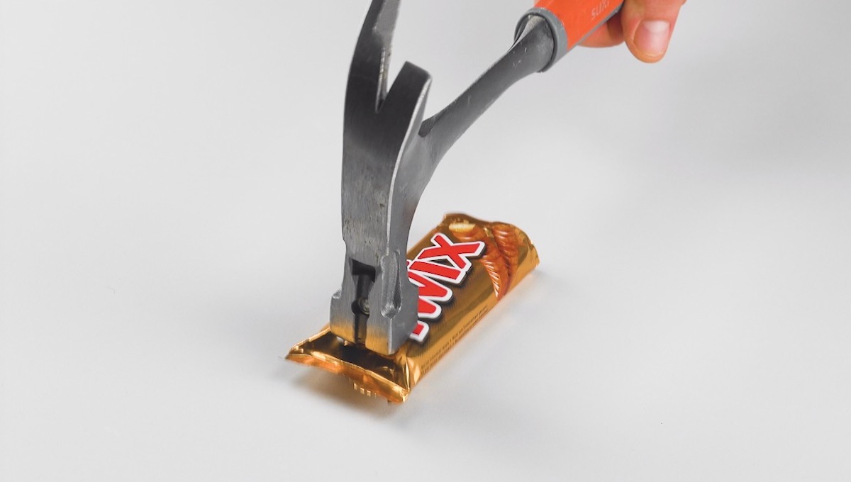 1.) Schlage mit einem Hammer auf die noch verpackten Twix-Riegel, bis sie in große Stückchen zerbrochen sind. Alternativ dazu kannst du die Riegel auch an eine Tischkante drücken und mit den Händen beim Zerkleinern etwas nachhelfen.