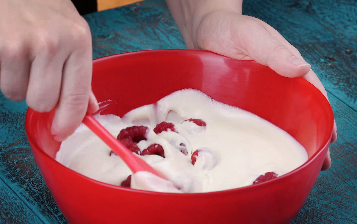 3.) Gib die Milch in einen Topf und schmilz die weiße Schokolade unter Rühren in ihr ein. Gib die Gelatineblätter dazu und fülle die Milch in eine Schüssel um, sobald die Blätter vollständig aufgelöst sind. Ist die Milch auf Zimmertemperatur abgekühlt, hebe die Sahne unter. Stelle die Mousse kalt. Hebe danach die Himbeeren vorsichtig unter.
