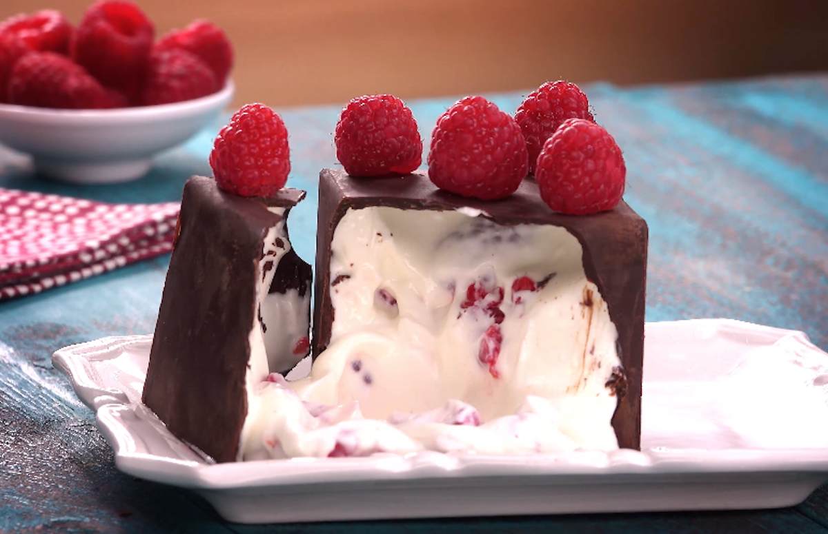 4.) Löffle die Mousse bis zum Rand in den Getränkekarton und stürze ihn auf einen Teller. Lasse den Schokoladenwürfel vorsichtig aus dem Karton rutschen und ziehe die Backpapierstreifen ab.
