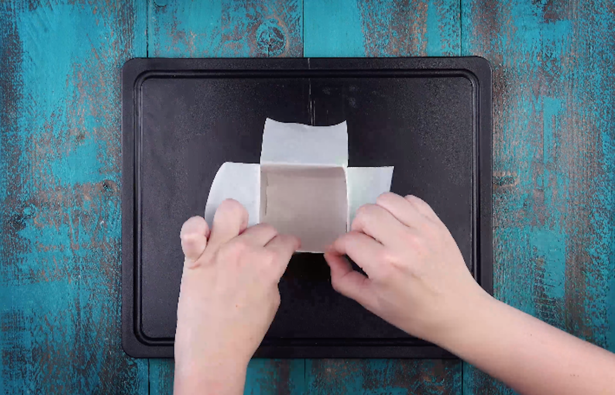 So geht es: 1.) Leere den Getränkekarton und wasche ihn gründlich aus. Schneide das obere Drittel des Kartons ab. Versuche dabei, die Kante möglichst gerade zu schneiden. Dein Ergebnis sieht aus wie eine kleine Box. Nun lege das Innere mit zwei bereits passend zugeschnittenen Streifen Backpapier aus, die sich auf dem Boden kreuzen.