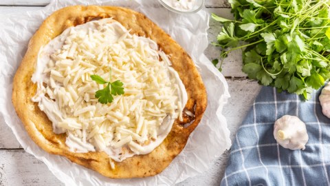 - Bestreiche sie mit der Creme und streue den Käse darüber. Die Langos werden am besten heiß serviert.