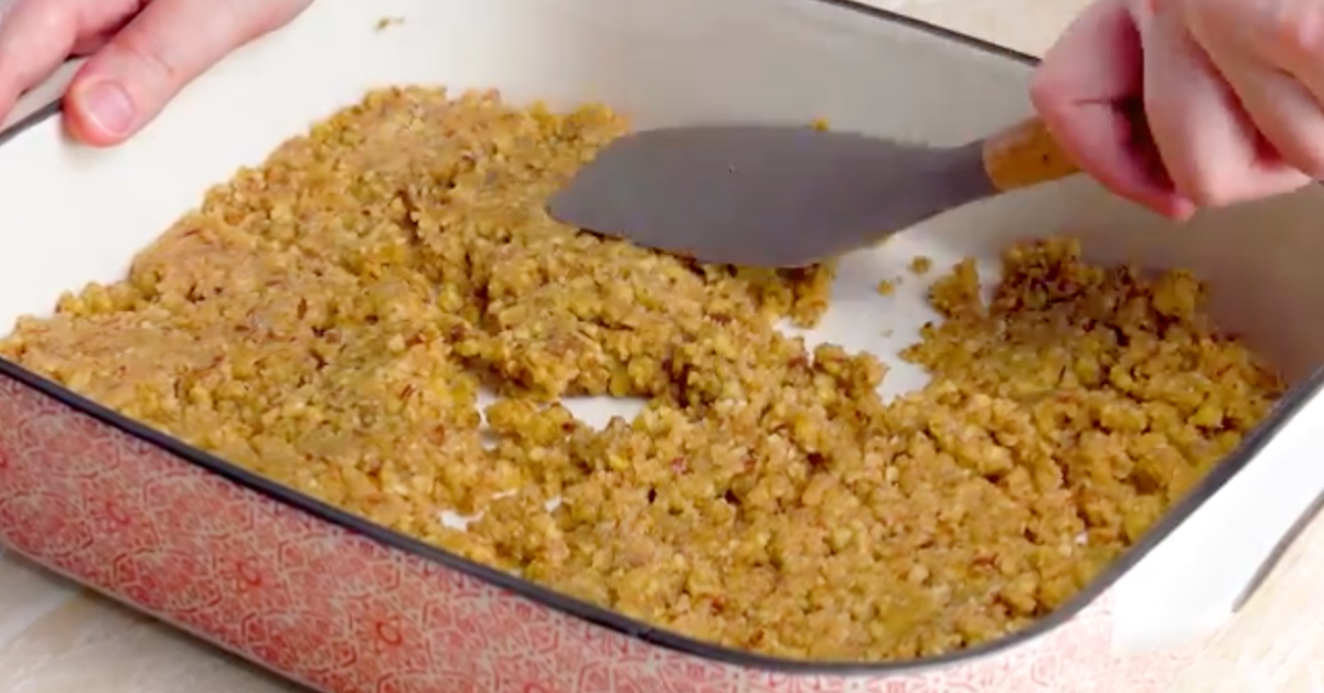 2.) Lege die Nussmasse in eine Auflaufform (Maße: etwa 23 x 33 cm), streiche sie glatt und drücke sie fest. Backe sie bei 175 °C für etwa 20 Minuten und lass die Schicht abkühlen.