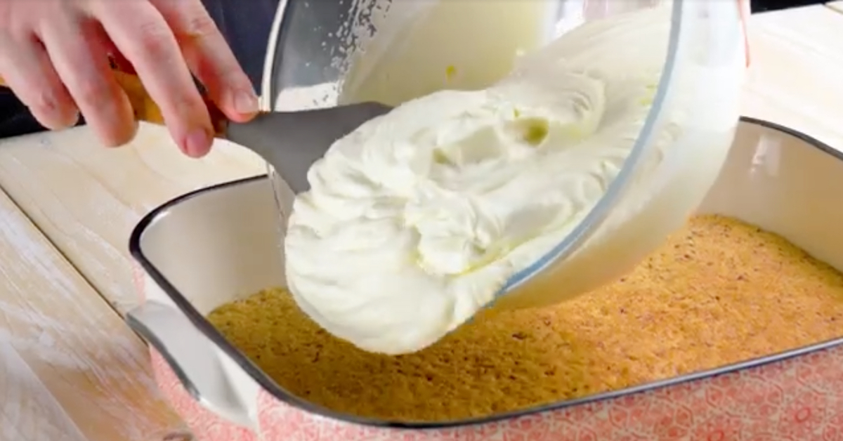 3.) Schlage die Sahne, den Frischkäse und den Puderzucker schön schaumig. Verteile die Sahnecreme auf der gebackenen Nussschicht und streiche sie glatt.