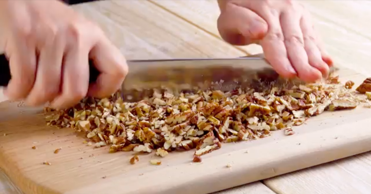1.) Hacke die Pekannüsse mit einem großen Messer ganz fein. Mische sie dann mit der geschmolzenen Butter, dem Zucker und dem Mehl und rühre alles zu einer nussigen Paste.
