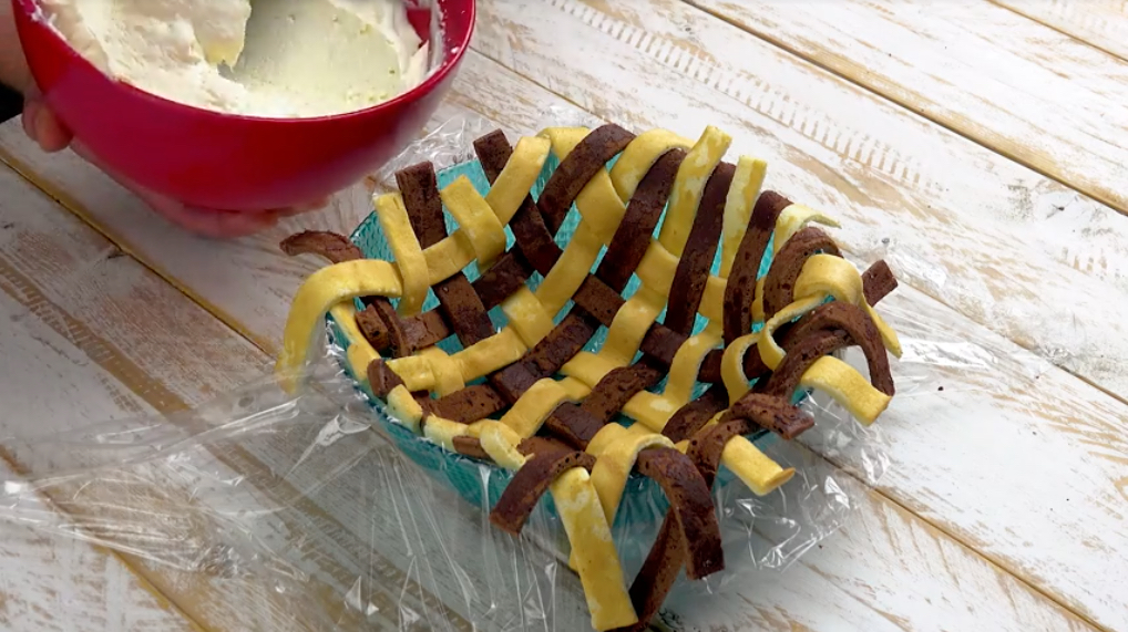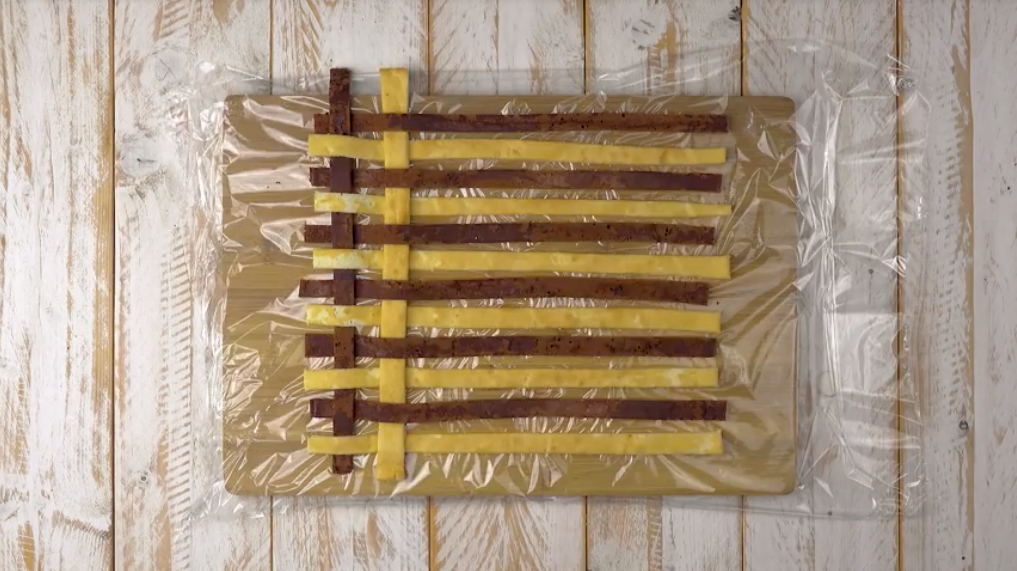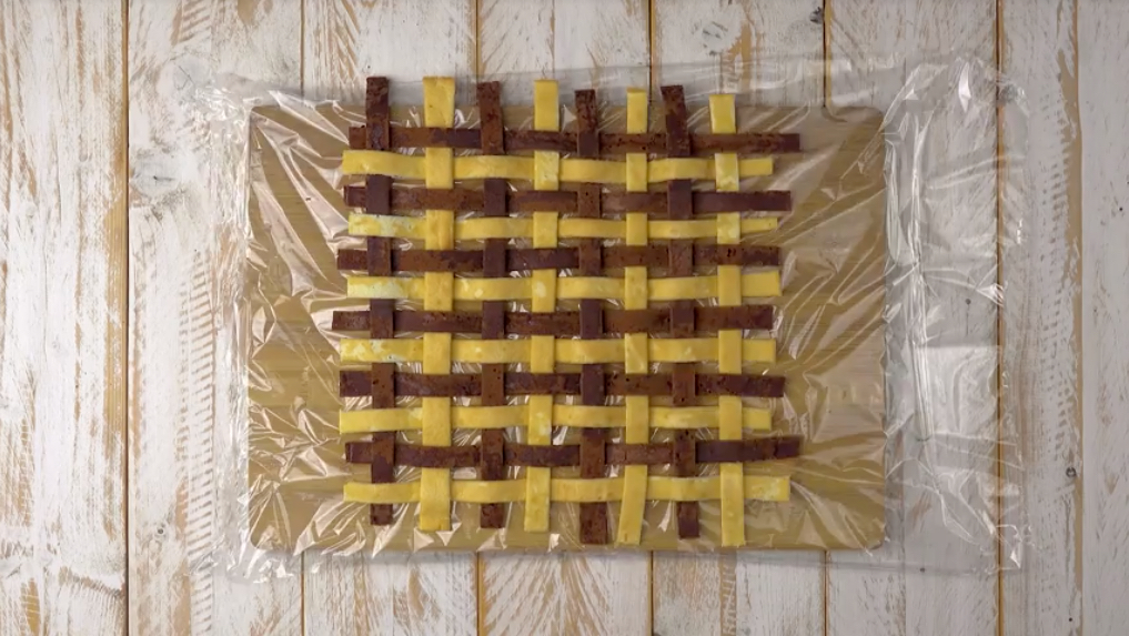 2.) Jetzt nimm die Böden vorsichtig vom Blech und lasse sie in feuchten Tüchern auskühlen. So werden sie elastisch und brechen später beim Flechten nicht durch. Schneide die Böden mit Hilfe eines Lineals in gleichmäßige dünne Streifen. Bedecke die Arbeitsplatte mit einer Lage Klarsichtfolie und flicht darauf aus den hellen und den dunklen Streifen das Gitter.