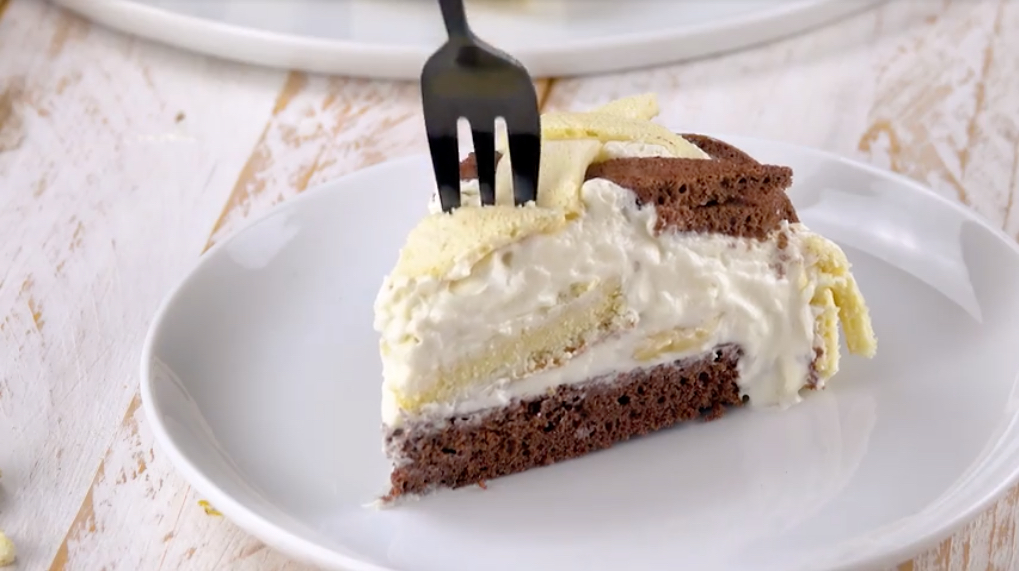 5.) Lege den hellen Biskuitboden auf die Cremeschicht. Darüber kommen wieder erst Frischkäsecreme, dann Bananenscheiben, dann wieder Creme und zum Schluss der dunkle Biskuitboden.
