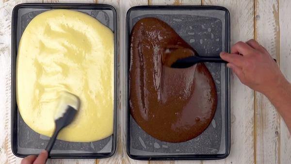 1.) Für den Biskuitteig schlägst du die Eigelbe, den Zucker, das Wasser und das Öl zusammen schaumig und gibst dann langsam das mit dem Backpulver vermischte Mehl hinzu. Teile die Masse in zwei gleiche Teile und vermische eine der beiden Hälften mit dem Kakao. Hebe das steif geschlagene Eiweiß gleichmäßig unter beide Teige. Fülle die helle und die dunkle Masse jeweils in ein mit Papier ausgelegtes Backblech und gib beide Bleche für 6-8 Minuten bei 175 °C Umluft in den Backofen.