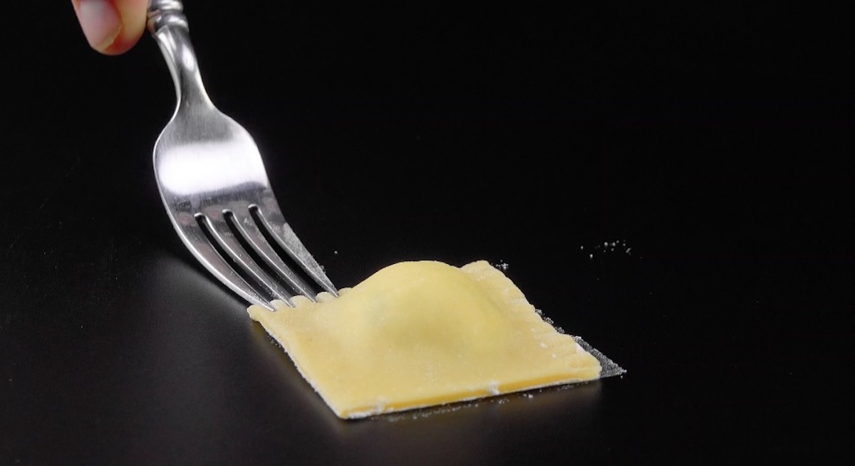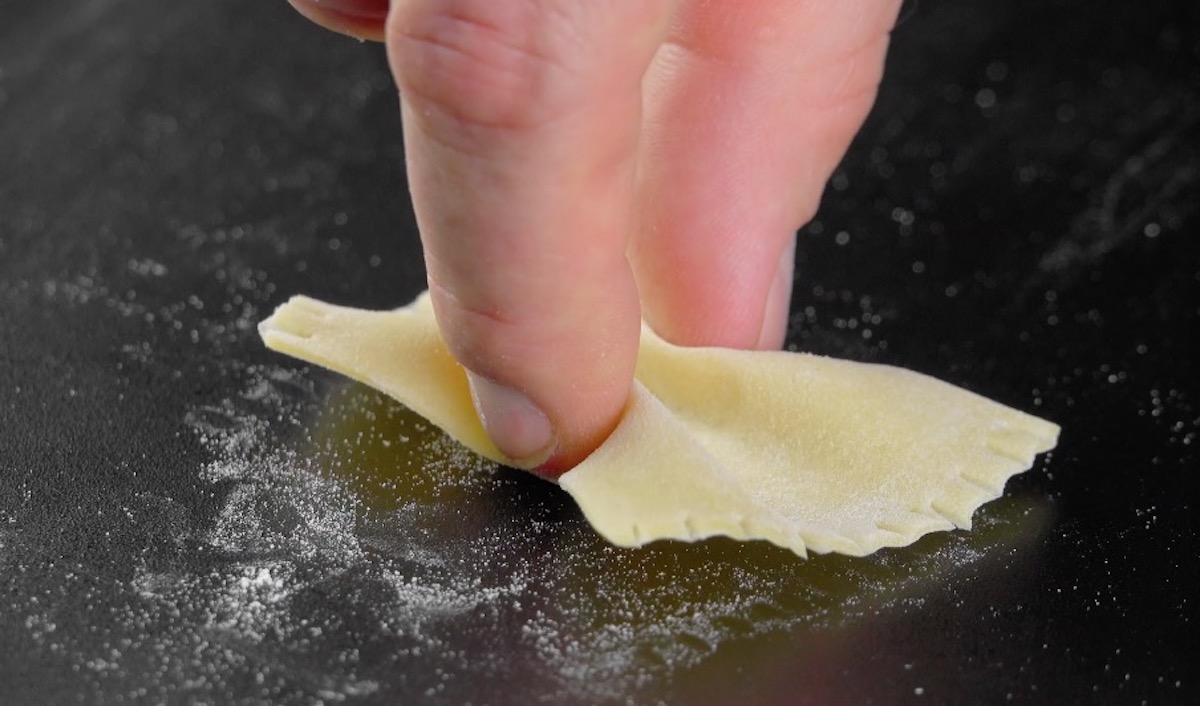 6.) Für die 4. Variante – Ravioli – musst du das letzte Viertel des Nudelteigs, den du am Anfang hergestellt hast, noch einmal halbieren. Rolle den Teig wieder auf der Arbeitsfläche aus. Vermenge alle Zutaten für die Ricotta-Füllung und gib sie mit einem Löffel auf den ausgerollten Teig. Bestreiche die Zwischenräume auf dem Teig mit Eigelb und lege die andere Hälfte des Teiges als ausgerollte Decke obendrauf. Schneide mit einem Messer gleich große Vierecke aus und drücke mit einer Gabel alle vier Seiten nochmals zusammen.