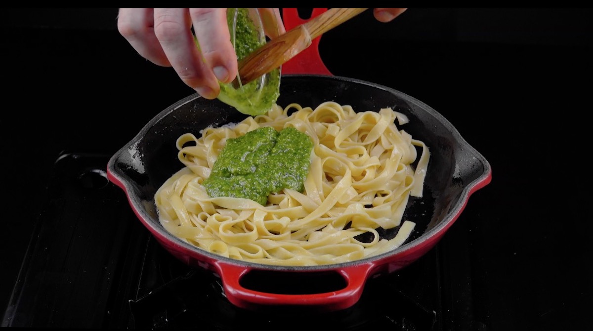 9.) Pesto hat man eigentlich immer im Haus, oder? Erhitze ein kleines Stück Butter in der Pfanne, gib die Tagliatelle und das Pesto hinein und schwenke alles in der Pfanne. Ein paar geröstete Pinienkerne und geriebener Parmesan runden das Gericht ab.