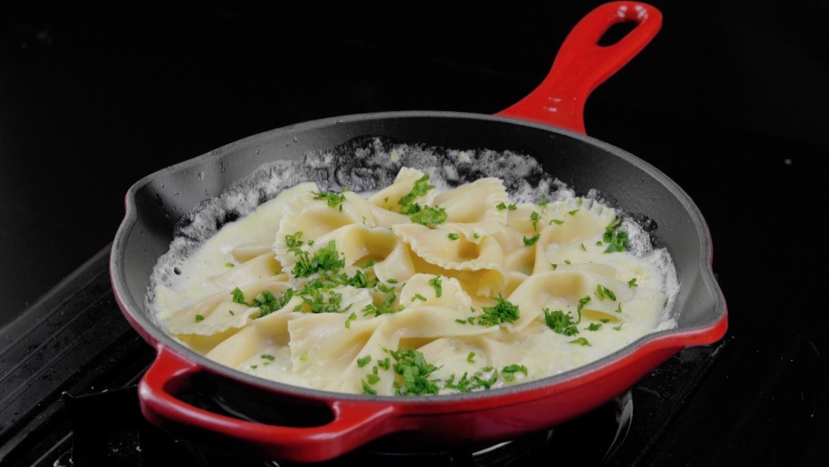 8.) Für die Farfalle in Sahnesoße brauchst du nur Butter, Sahne, eine Zitrone, Parmesan und Petersilie. Vermenge alles in einer Pfanne – und fertig sind die Schmetterlings-Nudeln.