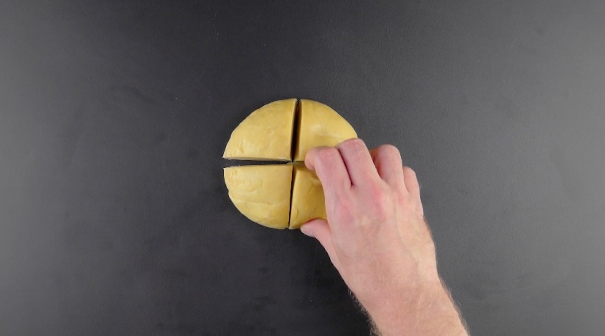 1.) Als Erstes musst du den für alle Pasta-Sorten gleichen Teig herstellen. Dafür brauchst du Hartweizenmehl, welches du haufenförmig auf eine glatte Arbeitsfläche gibst. Forme mit deinen Fingern eine Mulde in die Mehlmitte, gib die 4 Eigelb und das Ei hinein und verquirle das Ganze behutsam mit einer Gabel. Füge etwas Olivenöl und Wasser hinzu. Jetzt vermischst du alles mit dem Mehl und knetest die Masse zu einem gleichmäßigen Teig. Packe diesen in Frischhaltefolie ein und lass ihn im Kühlschrank eine Stunde ruhen. Danach schneidest du den Teig in 4 Teile, so hast du für jede Pasta-Sorte ein Viertel Teig zur Verfügung.