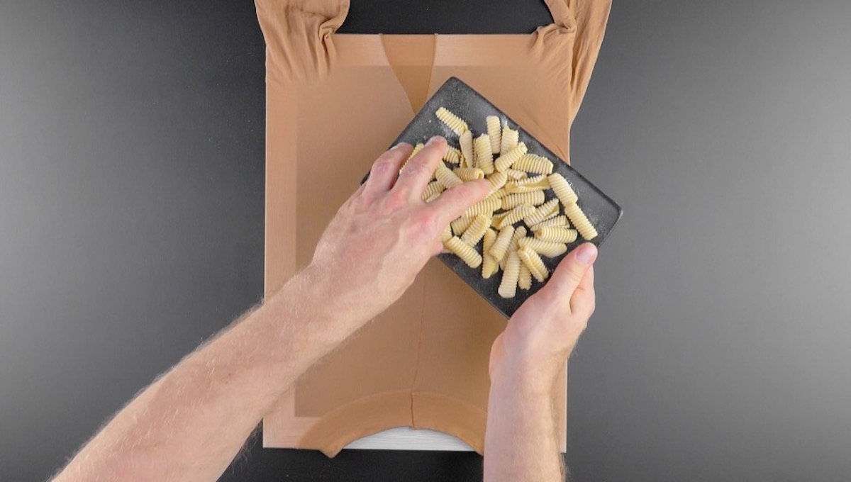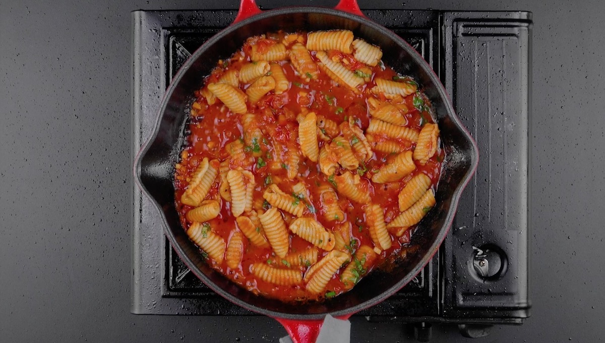 7.) Nachdem du jetzt weißt, wie man diese vier Pasta-Klassiker selbst herstellst, zeigen wir dir noch, welche Soßen am besten dazu passen. Die Castellane kann man hervorragend zu einer einfachen Tomatensoße essen. Brate eine Schalotte und eine Knoblauchzehe, beide klein gehackt, in einer Pfanne an. Gib noch klein geschnittene und passierte Tomaten hinzu, würze die Mischung mit Pfeffer, Salz und Basilikum. Gib alles auf einen Teller und streue etwas Parmesan obendrauf.