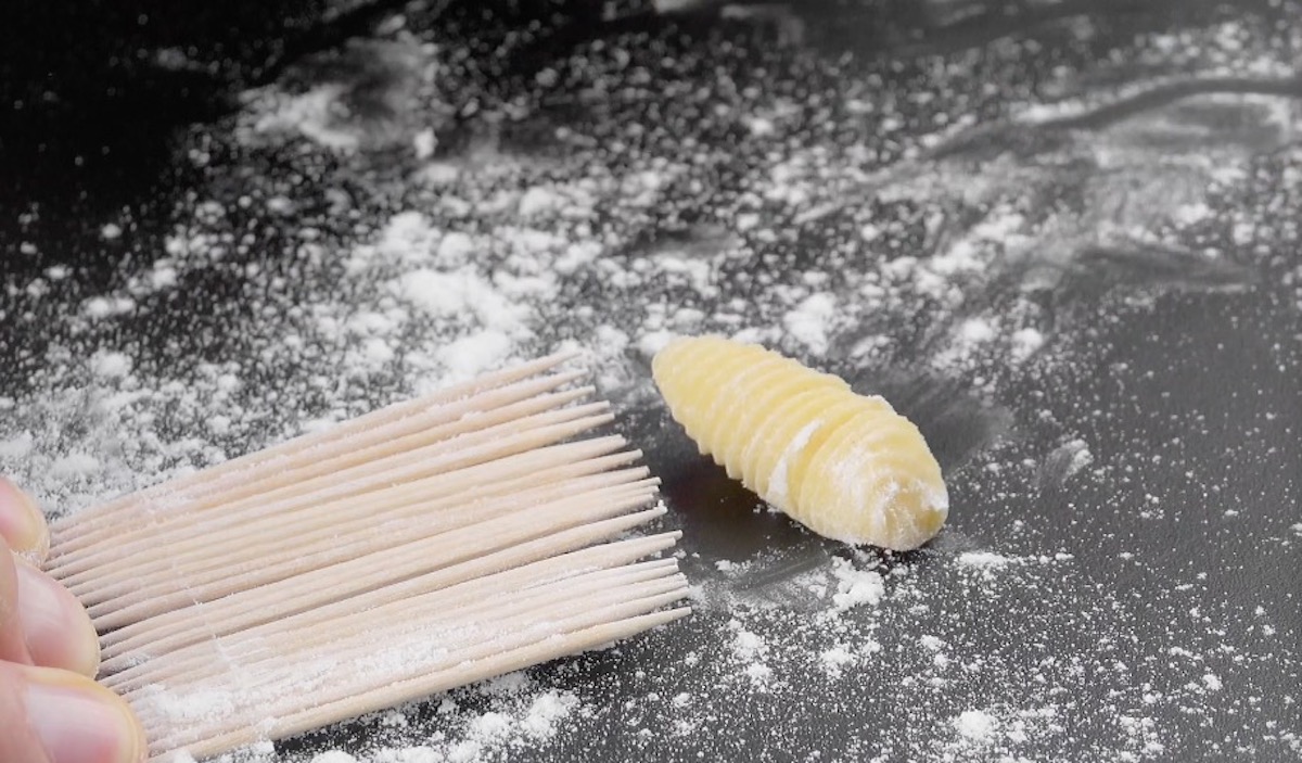 2.) Für die Castellane brauchst du jetzt das erste Teig-Viertel. Rolle mit einem Nudelholz den Teig platt und schneide mit einem Messer erst längs und dann quer Teigstreifen zurecht. Nun brauchst du Klebeband und Zahnstocher. Klebe ca. 20 Zahnstocher auf das Klebeband und streue Mehl darauf. Drücke nun die kleinen Teigstücke auf das Zahnstocher-Bett und rolle sie hin und her, sodass sie eine geriffelte Oberfläche bekommen.
