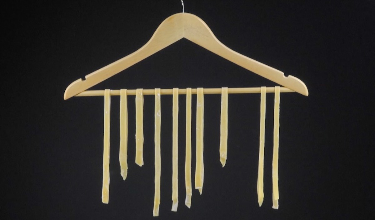 5.) Wie bei den ersten beiden Pasta-Varianten rollst du für die Tagliatelle erneut ein Teig-Viertel mithilfe eines Nudelholzes aus (wenn du kein Nudelholz besitzt, tut es auch eine leere Weinflasche). Nun rollst du den Teig ein, sodass du eine lange dünne Teigrolle erhältst. Schneide gleich große Stücke ab und wickele sie wieder aus. Hänge die langen Teigstreifen auf einen Kleiderbügel: Sie müssen nun mindestens 24 Stunden trocknen.