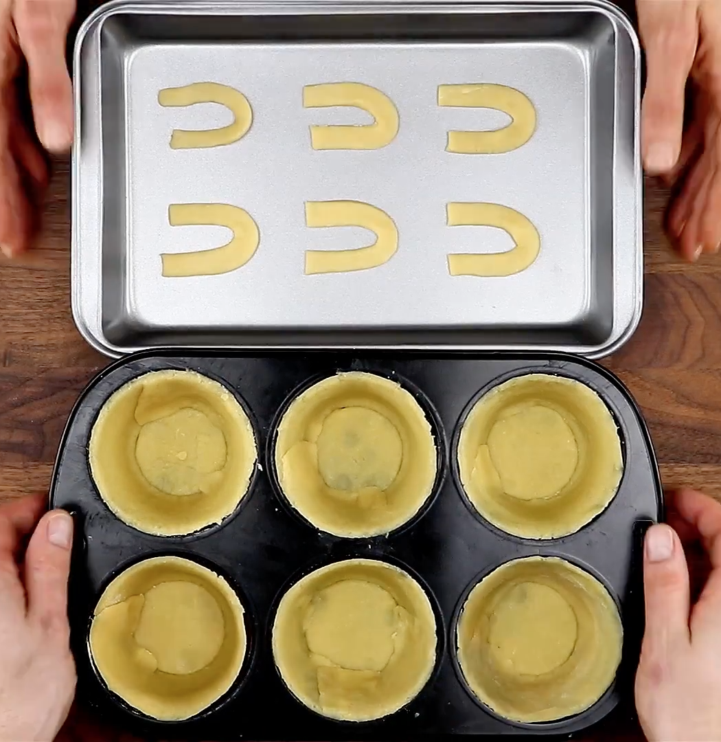 Lege die Kreise in den Boden einer Muffinform und die dicken Streifen um den Rand. So bleibt alles perfekt in Form. Die kurzen Streifen formst du zu einem U und gibst sie auf ein seperates Backblech. Jetzt wird alles bei 180 °C Umluft für 20 Minuten gebacken.