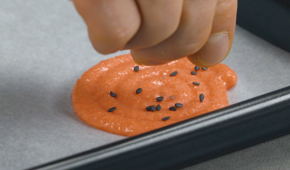 3.3 Lege ein Backblech mit Backpapier aus und spritze die rote Masse spiralförmig darauf. Bestreue die Spiralen mit schwarzem Sesam. Lass die Masse ca. 10 bis 12 Minuten antrocknen und schiebe das Blech dann bei 150 °C Ober- und Unterhitze für 12 bis 15 Minuten in den Ofen. Lass die gebackenen Spiralen danach komplett auskühlen.