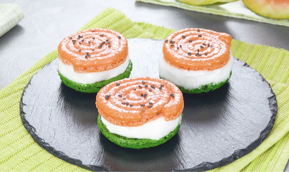 3.6 Kommen wir nun zum Zusammenbau. Nutze die grünen Macarons als Boden, lege eine Scheibe weißes Eis in die Mitte und setze einen roten Macaron als Deckel obendrauf.