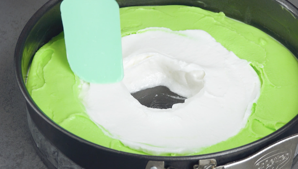 3.4 Gib die grüne Masse ebenfalls spiralförmig auf ein mit Backpapier ausgelegtes Backblech. Lass auch sie 10 bis 12 Minuten antrocknen und schiebe das Blech dann ebenfalls bei 150 °C Ober- und Unterhitze für 12 bis 15 Minuten in den Ofen.