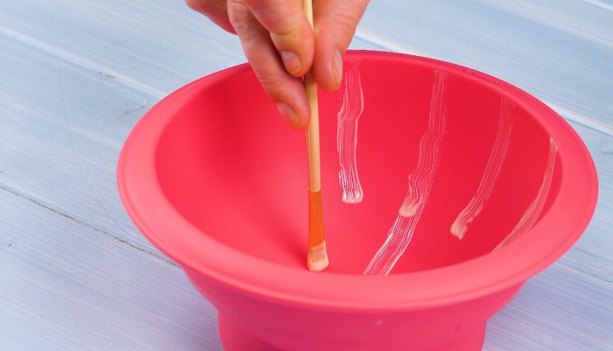 3.) Schmilz weiße Schokolade und temperiere sie. Male nun mit einem Pinsel leichte Striche in die Silikonform und lasse sie kurz trocknen.