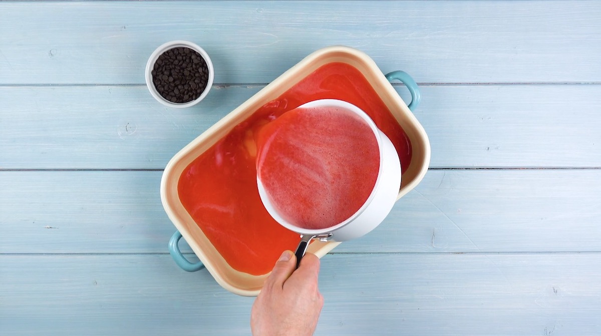 2.) Koche Zucker mit Wasser auf. Füge die zuvor in kaltem Wasser eingeweichte Gelatine hinzu und verrühre alles, bis die Gelatine aufgeweicht ist. Gib das Melonen-Püree hinzu, schütte alles in eine Form und stelle diese für ca. 10-15 Minuten in den Kühlschrank.