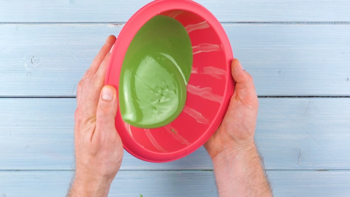 4.) Färbe die restliche weiße Schokolade mit der grünen Lebensmittelfarbe ein, gieße sie in die Silikonform und schwenke sie dabei so hin und her, dass die grüne Schokolade überall „kleben“ bleibt. Lasse die Schokolade bei Raumtemperatur kurz anziehen und stelle die Form dann in den Kühlschrank.