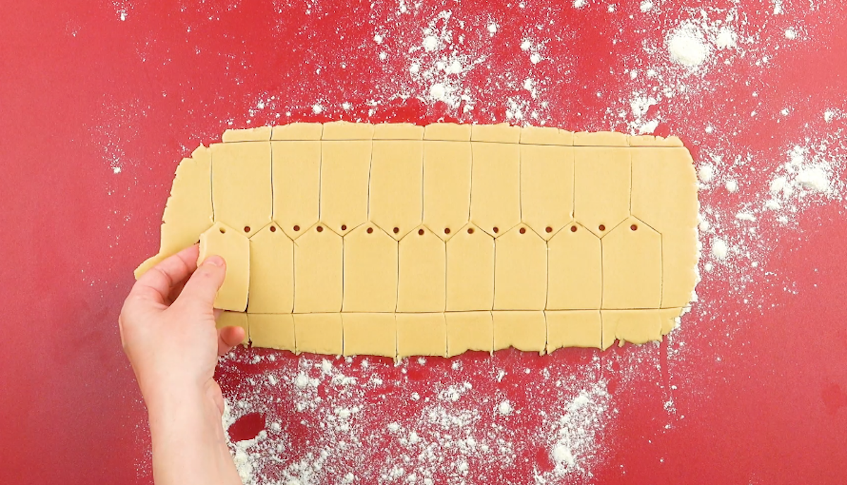 3.2) Rolle den Mürbeteig aus und schnitze mit einem Messer viele kleine Teebeutelumrisse in den Teig. Zum Ausstanzen der Löcher benutzt du einen Strohhalm. Lege die einzelnen Teebeutel auf ein mit Backpapier ausgelegtes Backblech. Backe sie bei 180 °C Umluft für 9 Minuten.