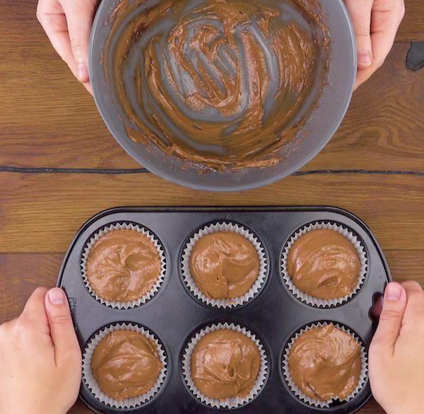 1.) Fülle alle Teigzutaten in eine Schüssel und rühre sie mit einem Handrührgerät zu einem Teig. Teile den Teig auf sechs Muffinförmchen auf, die du in ein Muffinblech setzt, damit sie ihre Form nicht verlieren. Backe die Muffins bei 160 °C Umluft für 20 Minuten im Ofen.