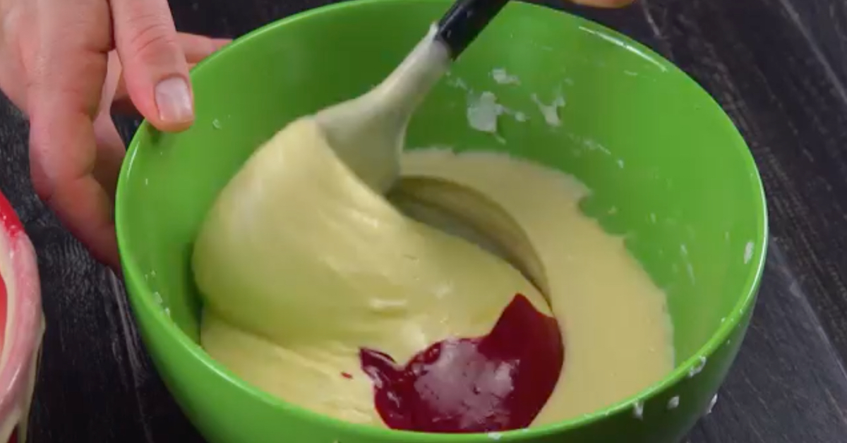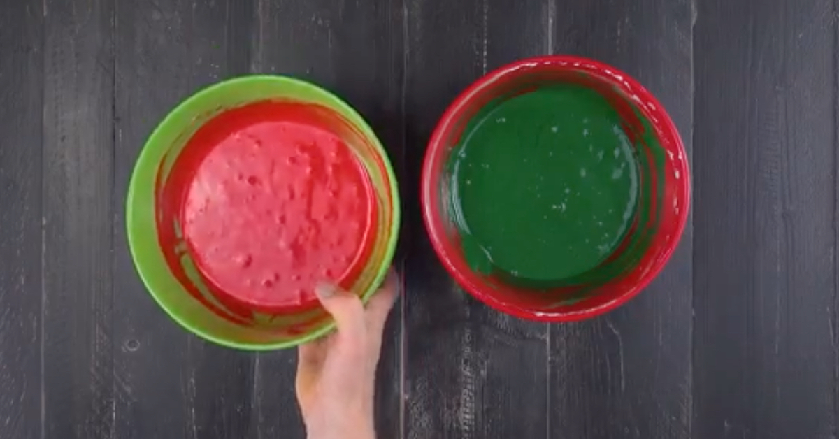 2.) Verteile diesen auf 2 Schüsseln. Jetzt färbst du die eine Hälfte mit Lebensmittelfarbe rot und die andere grün und rührst alles nochmal gut durch.