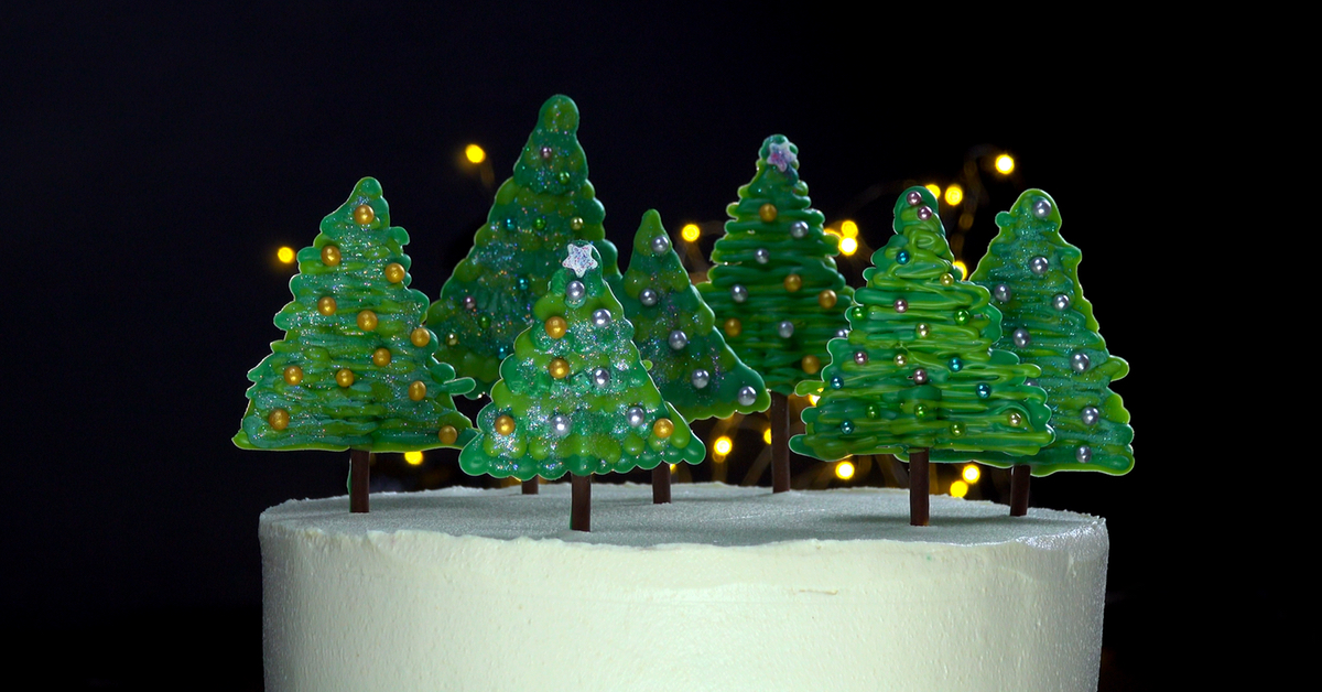 7.) Lass die Prachtbäumchen gut abkühlen, bevor du sie vorsichtig von der Folie löst, und stecke sie in die Torte. Ein Hauch von Puderzucker verleiht ihnen den perfekten, verschneiten Look.