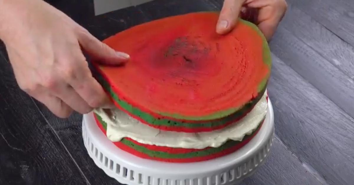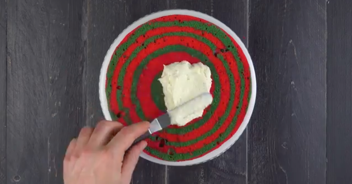 4.) Backe das rot-grüne Wunder für 60 Minuten und lass es dann gut auskühlen. Verrühre das Marzipan und den Frischkäse zu einem sahnigen Frosting. Schneide den Kuchen waagerecht in zwei Hälften und bedecke die erste Hälfte mit einer dicken Schicht Frosting.