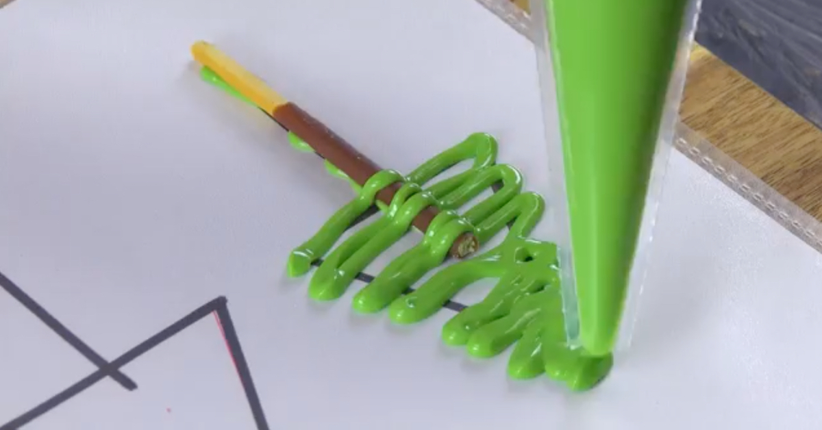 6.) Schmilz die weiße Schokolade im Wasserbad und färbe sie mit der Lebensmittelfarbe ein, in der du die künftigen Dekobäumchen sehen möchtest. Fülle die bunte Schokolade in eine Spritztüte. Zeichne die Bäumchen auf Papier vor, bedecke das Papier mit einer Plastikfolie und beginne mit der wahren Arbeit: Ein Schoko-Mikado bildet den Stamm, darüber wird das Tannengrün gelegt, und zum Schluss wird der Baum nach Lust und Laune mit Perlen und Glitzer geschmückt.