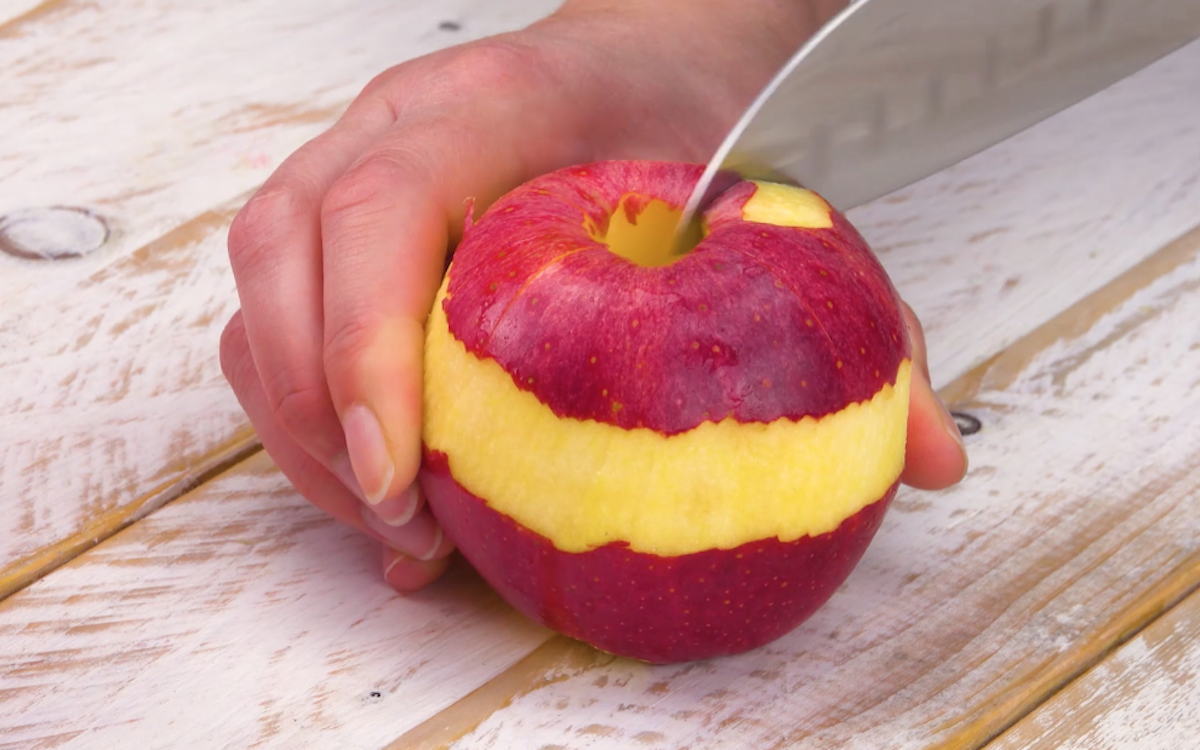 4.) Entferne das Kerngehäuse aus den Äpfeln mithilfe eines Apfelausstechers und schäle eine dekorative Spirale in die Fruchtschale. Schneide die Oberseite der Äpfel rundherum leicht mit dem Messer ein und schneide die Unterseite zu einer glatten Fläche, damit die Äpfel eine Standfläche haben.